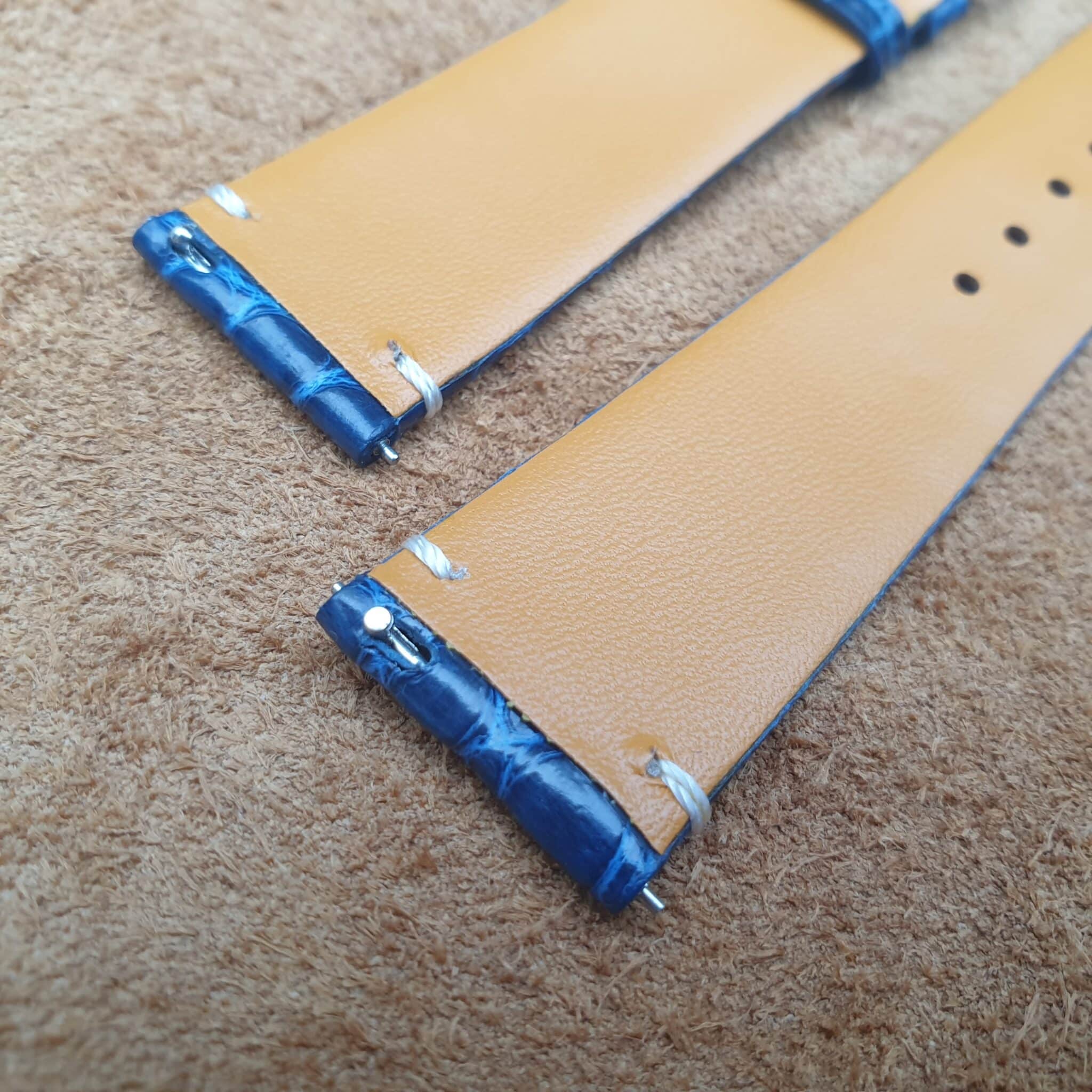 Note from Rob – Shop manager: stained blue to achieve high gloss. Blue will scratch unless you take care. I suggest you keep for your best watch and only use occasionally. If you do not agree to this then do not purchase this strap as no warranty on ‘wear and tear’ scratches etc. Choose clasp for longevity instead of buckle as buckle will scratch into blue each time it is fastened.