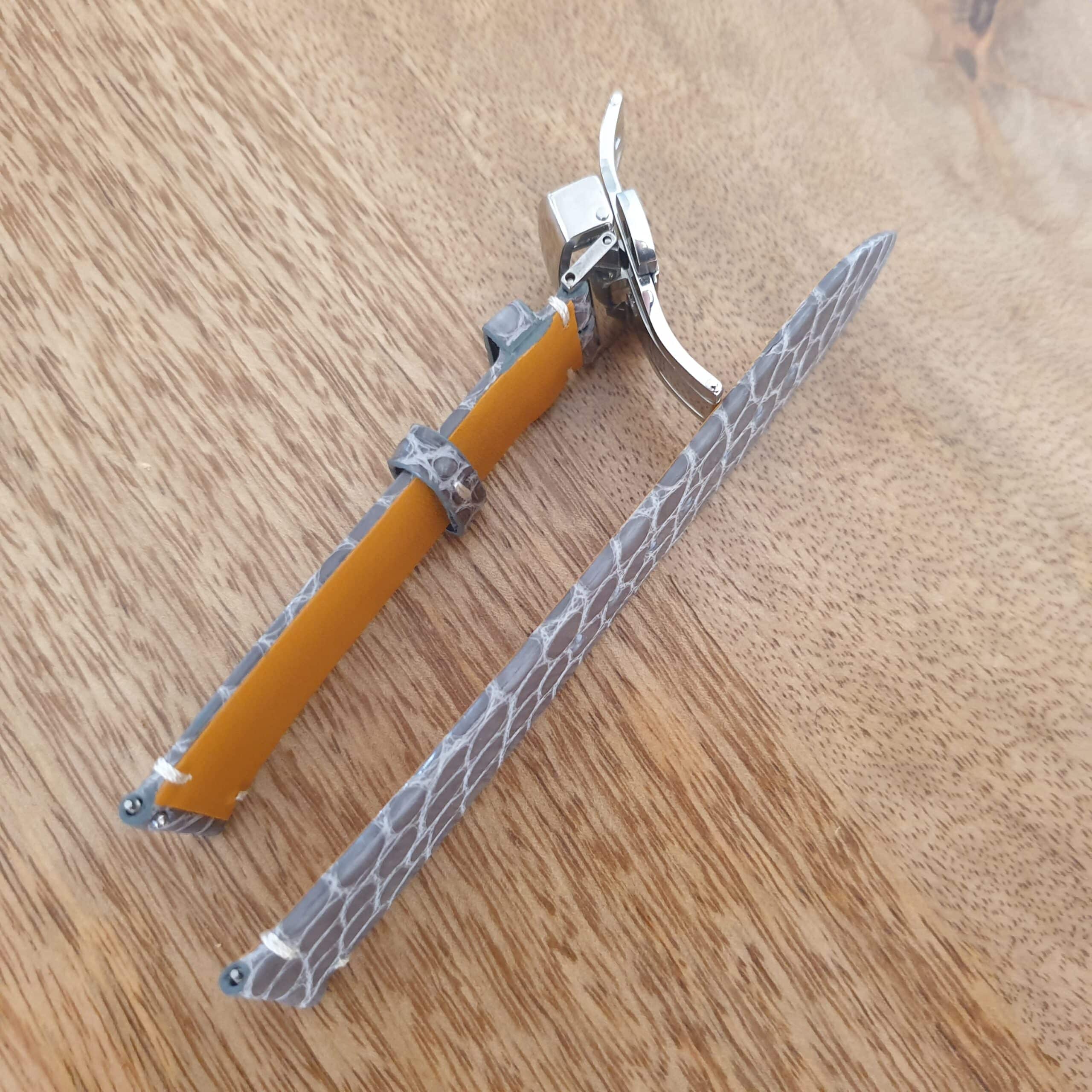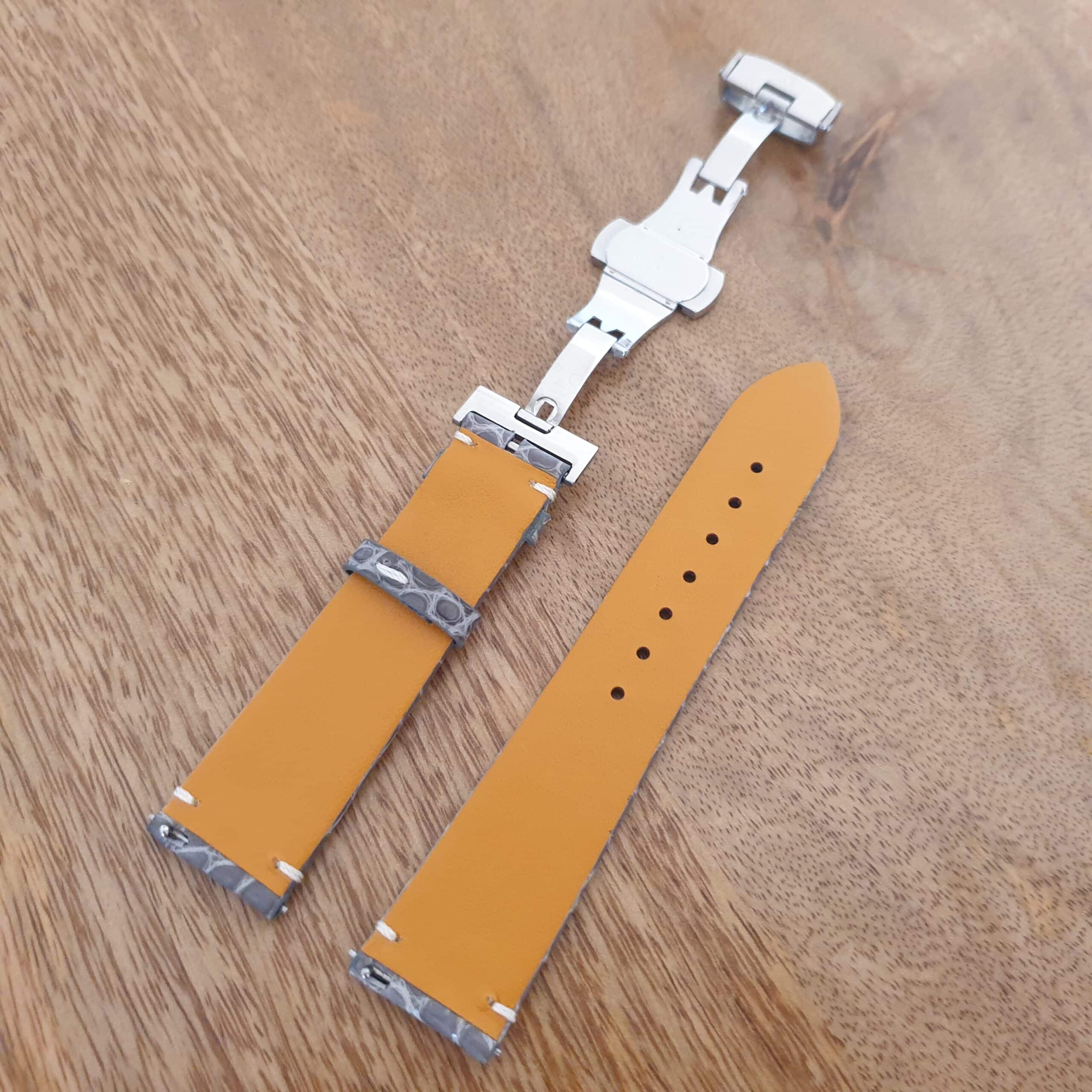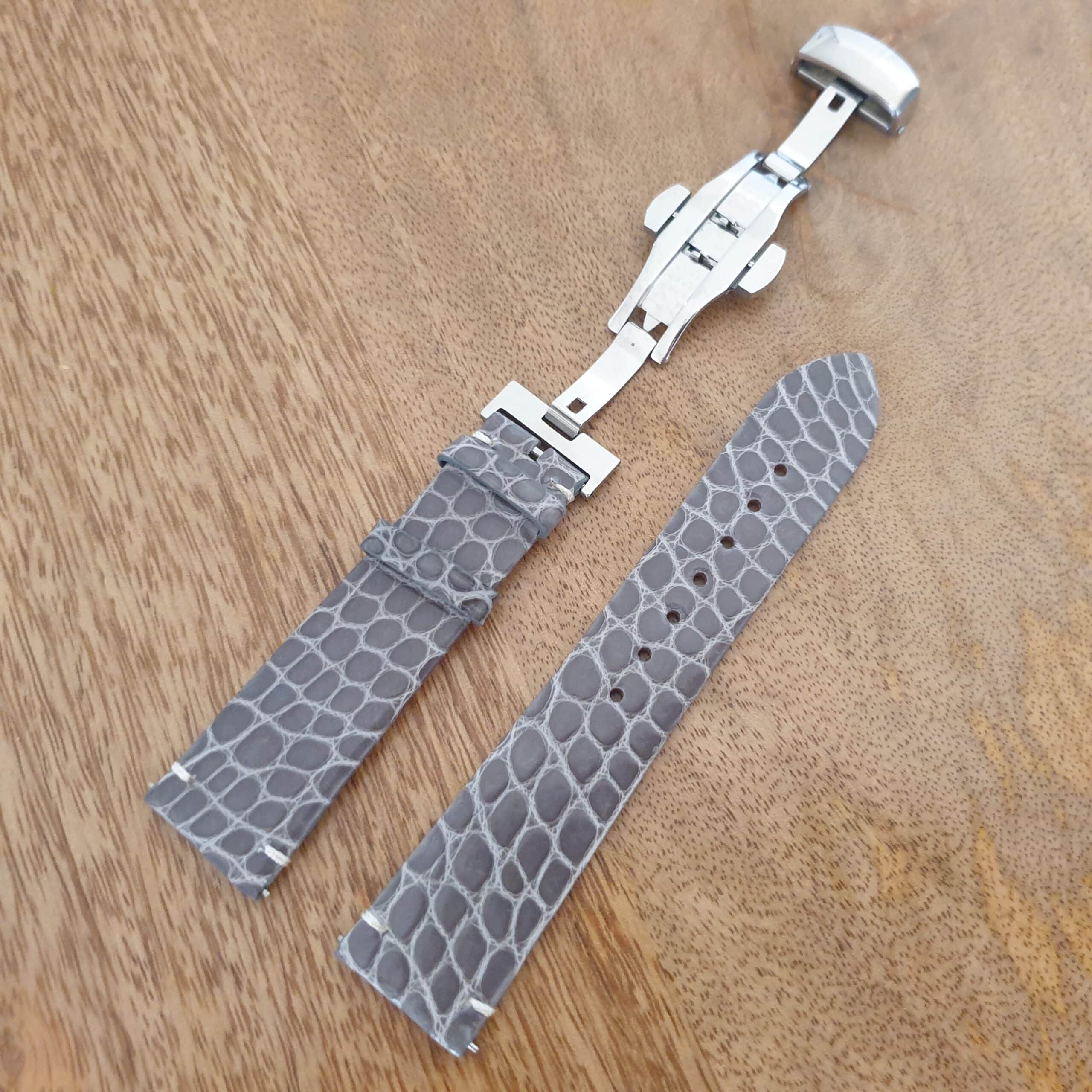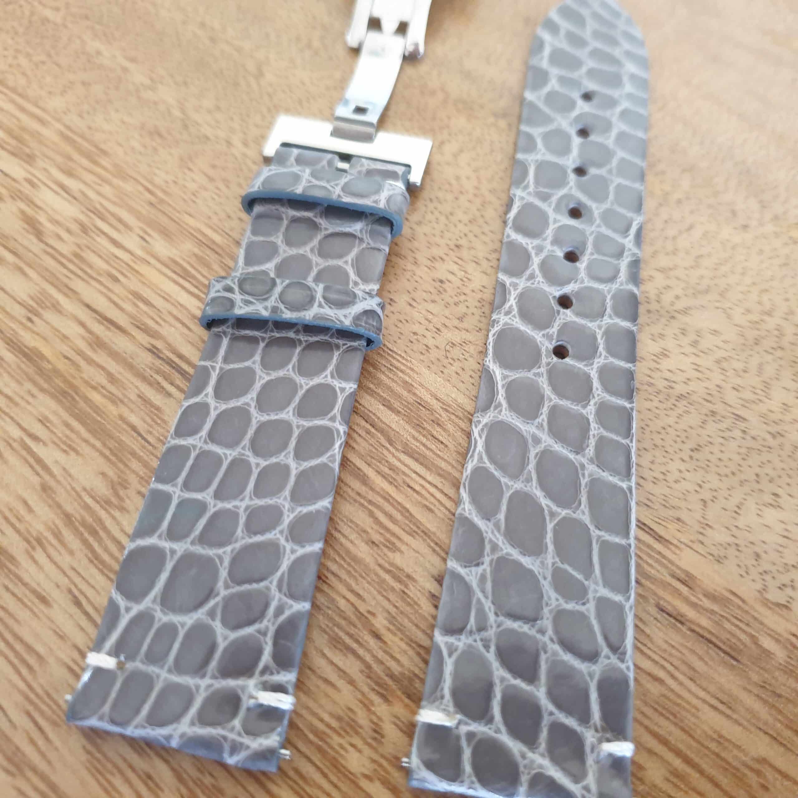 Note from Rob – Shop manager: stained to achieve high gloss. Grey will scratch unless you take care. I suggest you keep for your best watch and only use occasionally. If you do not agree to this then do not purchase this strap as no warranty on ‘wear and tear’ scratches etc. Choose clasp for longevity instead of buckle as buckle will scratch into grey finish each time it is fastened.